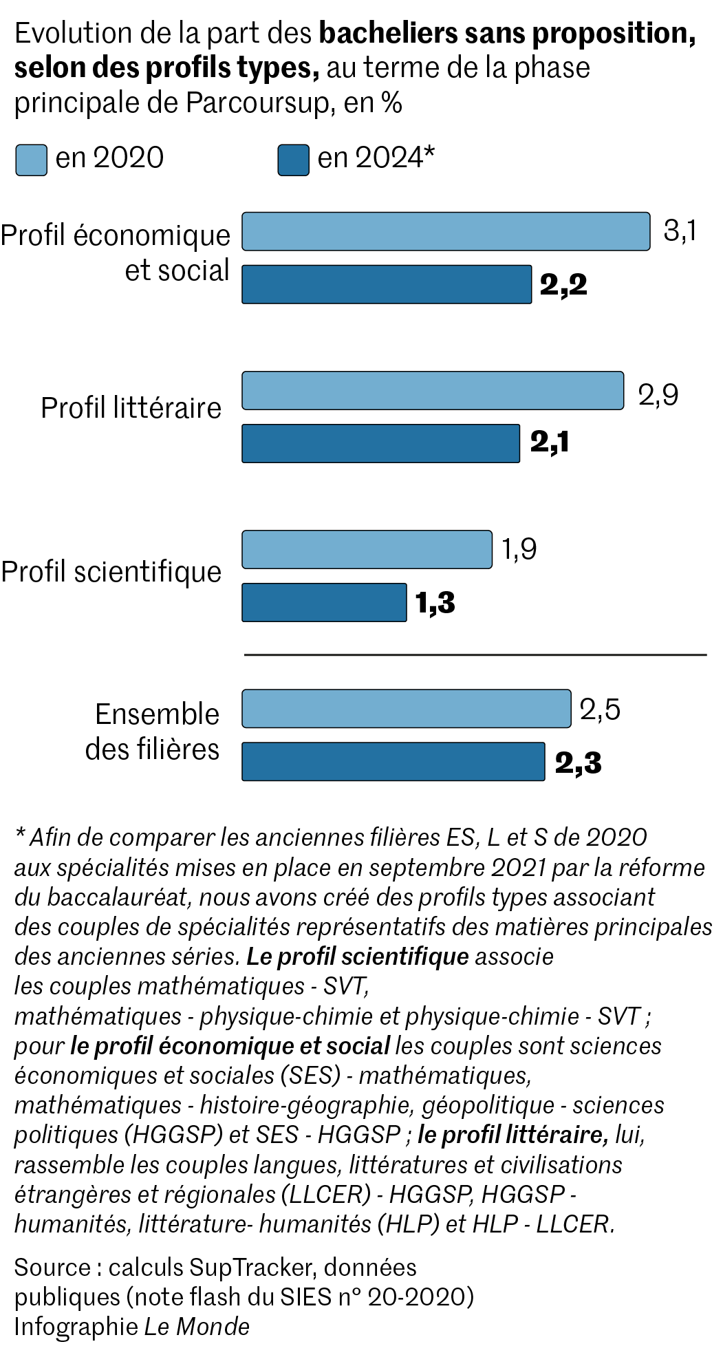 Le Monde propose un bilan permettant d’apprécier l’influence de ces spécialités,créées en vue de la réforme du bac de 2021,sur les chances de recevoir une proposition d’admission dans le supérieur. L’ensemble des doublettes de disciplines choisies par les élèves de terminale ont été passées en revue à partir des données Parcoursup exploitées par Nagui Bechichi,économiste de l’éducation rattaché à l’Institut des politiques publiques,cofondateur de l’outil en ligne gratuit SupTracker qui publie,mercredi 15 janvier,une série inédite de graphiques.
