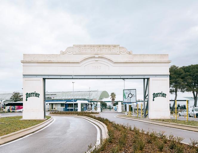L’entrée du site Perrier,à Vergèze (Gard),le 13 février. SANDRA MEHL POUR M LE MAGAZINE DU MONDE Ici,tous les chemins mènent à la source. Entre les vignes et les prairies pour chevaux,autour des halles ou depuis l’autoroute A9,chaque carrefour indique la direction « source Perrier ». Vergèze,5 000 habitants,vit au rythme de l’eau pétillante la plus connue au monde. Depuis plus de cent soixante ans,la petite bouteille verte bombée est produite ici,entre Nîmes et Montpellier,dans le Gard.