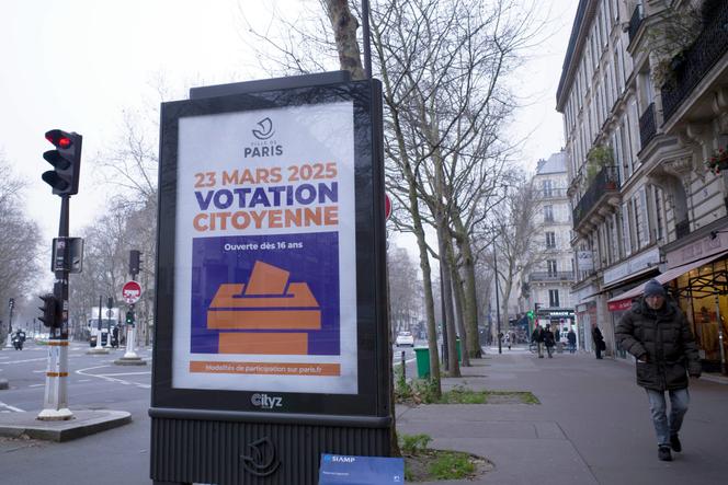 Une affiche pour la votation citoyenne,à Paris,le 7 janvier 2025. BRUNO LEVESQUE/IP3 PRESS/MAXPPP Ce sera la troisième fois que les Parisiens seront invités à voter pour autre chose que des élections. Dimanche 23 mars,la Ville de Paris organise une nouvelle votation – sans doute la dernière de la mandature de la maire,Anne Hidalgo – afin de recueillir l’avis de ses résidents sur la question suivante : pour ou contre végétaliser et rendre piétonnes 500 nouvelles rues dans la capitale ?