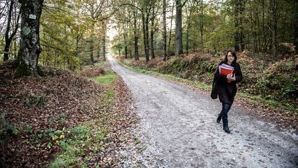 Marie Dosé,l'avocate de la fille de Robert Boulin,à l'occasion d'une reconstitution de la découverte du corps du ministre dans la forêt de Rambouillet (Yvelines),le 28 octobre 2019. (MARTIN BUREAU / AFP)