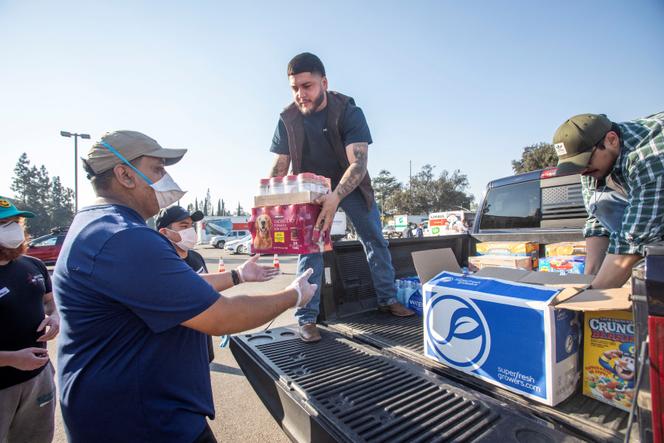 De l’aide arrive au centre de distribution YMCA du Pasadena City College après que les habitants ont fui l’incendie Eaton,le 11 janvier 2025. RINGO CHIU / REUTERS Coincé sous l’essuie-glace arrière d’une voiture garée devant l’église Calvary,dans le quartier sud de Pasadena,un carton propose des « jouets et vêtements gratuits pour les victimes des incendies ». Dans le petit édifice presbytérien transformé en centre de dons,des couvertures,jeux et ustensiles de cuisine sont triés,étiquetés et installés sur des tables de fortune,avant de partir vers des lieux de stockage. Juste devant,sur l’avenue Fremont,la même scène de conductrices descendant les bras chargés de sacs pour les déposer à l’église se duplique à l’infini,à quelques pâtés de maisons à peine des 57 kilomètres carrés dévastés par l’Eaton Fire,un des incendies qui ravagent Los Angeles depuis mardi 7 janvier.
