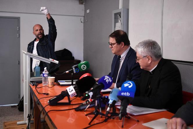 Arnaud Gallais (à gauche),cofondateur de l’association Mouv’Enfants,lors d’une conférence de presse convoquée par l’évêque de Bayonne,Marc Aillet (à droite),au sujet des violences sexuelles et physiques commises dans des établissements catholiques de son diocèse,le 13 mars 2025. GAIZKA IROZ/AFP « Bonjour à tous,bienvenue pour cette… » « Soutien aux victimes ! Soutien aux victimes ! Je suis Arnaud Gallais,je fais partie des 330 000 victimes de pédocriminalité dans l’Eglise et je dénonce ce simulacre. »
