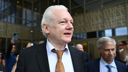 Le fondateur de WikiLeaks Julian Assange quitte le tribunal fédéral de Saipan,aux îles Mariannes du Nord,un territoire américain du Pacifique,le 26 juin 2024. (YUICHI YAMAZAKI / AFP)