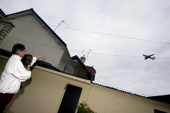 Un avion passant à basse altitude au-dessus de Villeneuve-Le-Roi (Val-de-Marne),une commune voisine de l’aéroport d’Orly,le 12 juillet 2004. JOEL ROBINE / AFP Moins de cinq minutes après être sorti de la gare du RER C de Villeneuve-le-Roi,dans le Val-de-Marne,le bruit se fait entendre. Un vrombissement progressif qui envahit le ciel et occupe tout l’espace sonore pendant de longues secondes : un avion vient de décoller de l’aéroport voisin d’Orly,dont l’une des trois pistes est mitoyenne de la commune,séparée des maisons d’un simple mur de 2 mètres de hauteur.