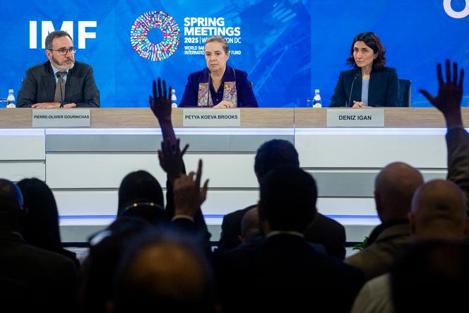 Pierre-Olivier Gourinchas,chef économiste du Fonds monétaire international,Petya Koeva Brooks,directrice adjointe,et Deniz Igan,cheffe de la division des études économiques du FMI,à Washington,le 22 avril 2025. JIM WATSON / AFP C’est au tour du Fonds monétaire international (FMI) et de la Banque mondiale,les deux piliers du système économique mondial mis en place à l’après-guerre,d’affronter l’orage Trump. Leurs premières réunions depuis le retour à la Maison Blanche du milliardaire,en janvier,se déroulent la semaine du 21 avril à Washington,dans un contexte inédit.