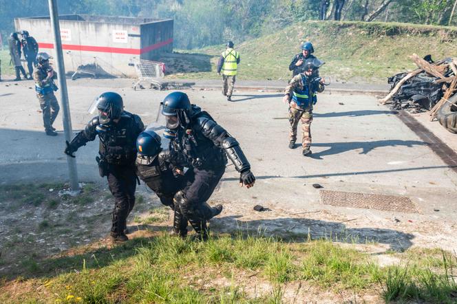 Des gendarmes mobiles lors d’un exercice au centre national d’entraînement des forces de gendarmerie à Saint-Astier (Dordogne),le 9 avril 2025. FABRICE HEBERT/COLLECTIF DR L’explosion d’un énorme pétard artisanal ne fait pas ciller les gendarmes mobiles caparaçonnés,disposés à l’angle de la place de la République et de la rue du Temple,dans le 3e arrondissement de Paris. Sous leurs casques,un dispositif acoustique de dernière génération a isolé leurs tympans en une milliseconde au moment de la déflagration. Sur les ondes,un drone équipé d’un système de comptage de la foule par intelligence artificielle (IA) annonce d’une voix synthétique : « Volume des éléments hostiles,56. »