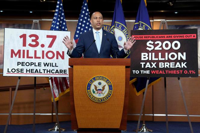 Le chef des démocrates à la Chambre des représentants,Hakeem Jeffries,lors d’une conférence de presse au Capitole,à Washington,le 13 mai 2025. KEVIN DIETSCH / AFP L’équation est complexe et les républicains s’échinent,depuis plusieurs jours,à la résoudre. Comment gagner quelques centaines de milliards de dollars aux dépens d’un dispositif auquel Donald Trump a promis,à de multiples reprises,de ne pas toucher ? Le programme Medicaid,qui permet à quelque 70 millions de personnes issues de foyers à faibles revenus,dont 40 % d’enfants,de bénéficier d’une couverture de santé,est au cœur des discussions sur le texte budgétaire,baptisé par le président des Etats-Unis « big,beautiful bill » (le « grand et beau projet de loi »).