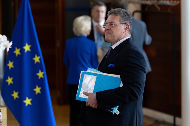 Le commissaire européen au commerce,Maros Sefcovic,avant la réunion hebdomadaire du collège des commissaires au siège de l’Union européenne,à Bruxelles,le 9 avril 2025. OMAR HAVANA / AP Près de trois mois après l’investiture de Donald Trump,les négociations entre les Etats-Unis et l’Union européenne (UE) pour désamorcer la guerre commerciale n’ont toujours pas commencé. Des contacts existent certes entre l’administration de Donald Trump et la Commission,compétente en matière de commerce. Mais,à ce stade,ils n’ont pas permis,du point de vue de Bruxelles en tout cas,d’engager de discussion sérieuse et structurée.