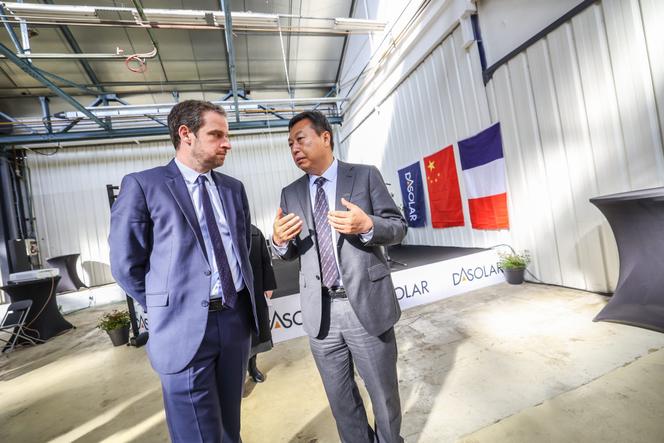 Le président de DAS Solar,Yong Liu (à droite),présente l’implantation de la future gigafactory photovoltaïque à Rémi Bastille,le préfet du Doubs,à Mandeure,le 11 avril 2025. LIONEL VADAM/« L'EST REPUBLICAIN »/MAXPPP Quatorze usines de fabrication de panneaux solaires photovoltaïques,avec quelque 8 900 salariés : voilà le profil dont se prévaut DAS Solar en République populaire de Chine. Fondé en 2018,le groupe privé chinois projette aujourd’hui d’inaugurer une usine en Europe,dans la commune de Mandeure (Doubs),où il a racheté aux pouvoirs publics,en novembre 2024,une friche de près de 100 000 mètres carrés délaissée par l’équipementier automobile Forvia (ex-Faurecia),non loin de la frontière suisse et de l’Allemagne.