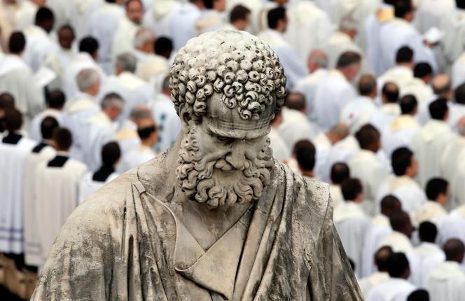 La statue de l’apôtre saint Pierre,sur la place Saint-Pierre,au Vatican,le 24 novembre 2013. STEFANO RELLANDINI / REUTERS « Saint Pierre,de Bethsaïde en Galilée,prince des apôtres,reçut de Jésus-Christ le pouvoir pontifical suprême à transmettre à ses successeurs »,indique sommairement l’Annuaire pontifical,édité chaque année par le Vatican,pour retracer les origines de l’institution. Si l’on en croit la tradition catholique,Pierre serait donc le premier des 266 papes qui se sont succédé à Rome jusqu’à nos jours. Rome,ultime étape des pérégrinations missionnaires de Pierre,où il aurait été crucifié sous le règne de Néron,dans les années 60.